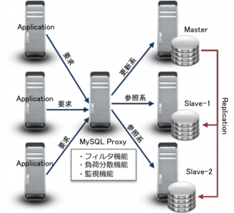MySQL Proxyはフィルタ定義、負荷分散定義を行う事で更新系リクエストに対する振り分けや参照系リクエストに対する負荷分散などを行う事ができます。
